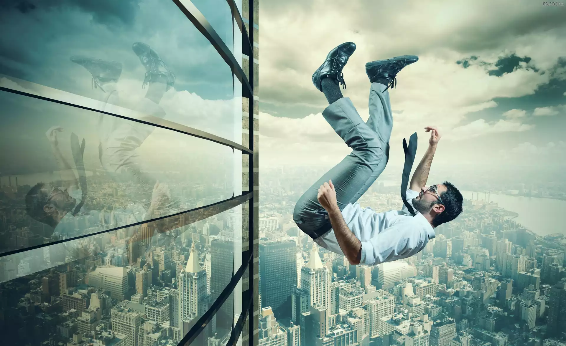 Miasto, Spadający, Grafika, Upadek, Panorama, Wieżowiec, Mężczyzna - faceci.biz